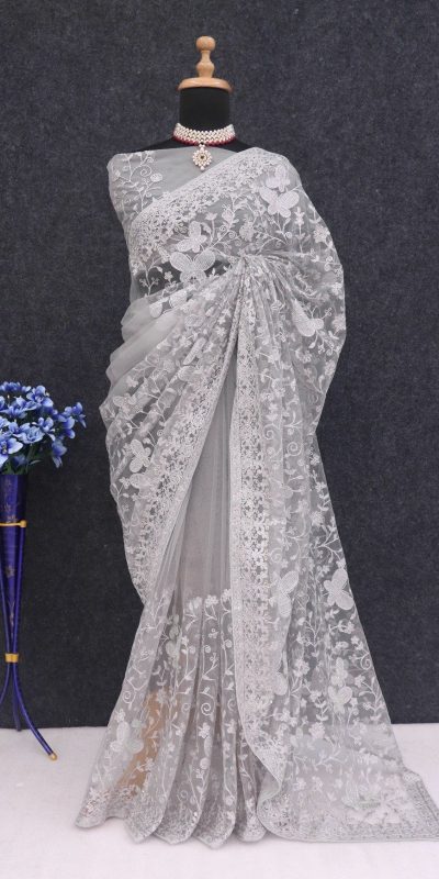 Mystical Blue Color Butterfly Net Embroidery Sequence Saree