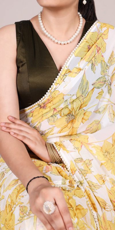 Nice Yellow Color Weightless Marble Floral Print Pearl Lace Border Saree
