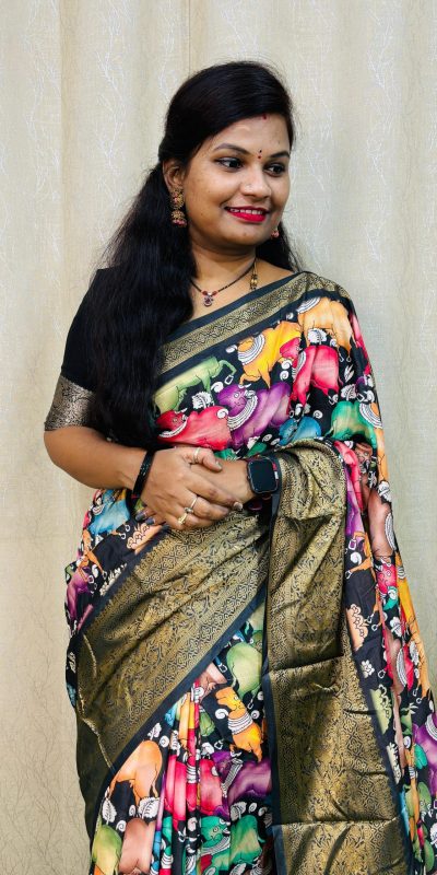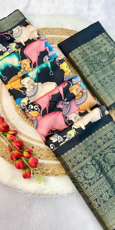 MS Black Color Jacquard Dola Silk With Kalamkari Print Saree Casual, Wedding, Festive, Events . Expected Delivery  4-6 Working Days @1549/- only