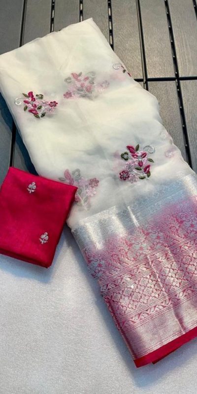 MS 431 White Color Nylon Organza Jacquard Embroidered Saree Casual, Party Wear, Wedding, Events, Etc. Expected Delivery 4-6 Working Days 1599/-