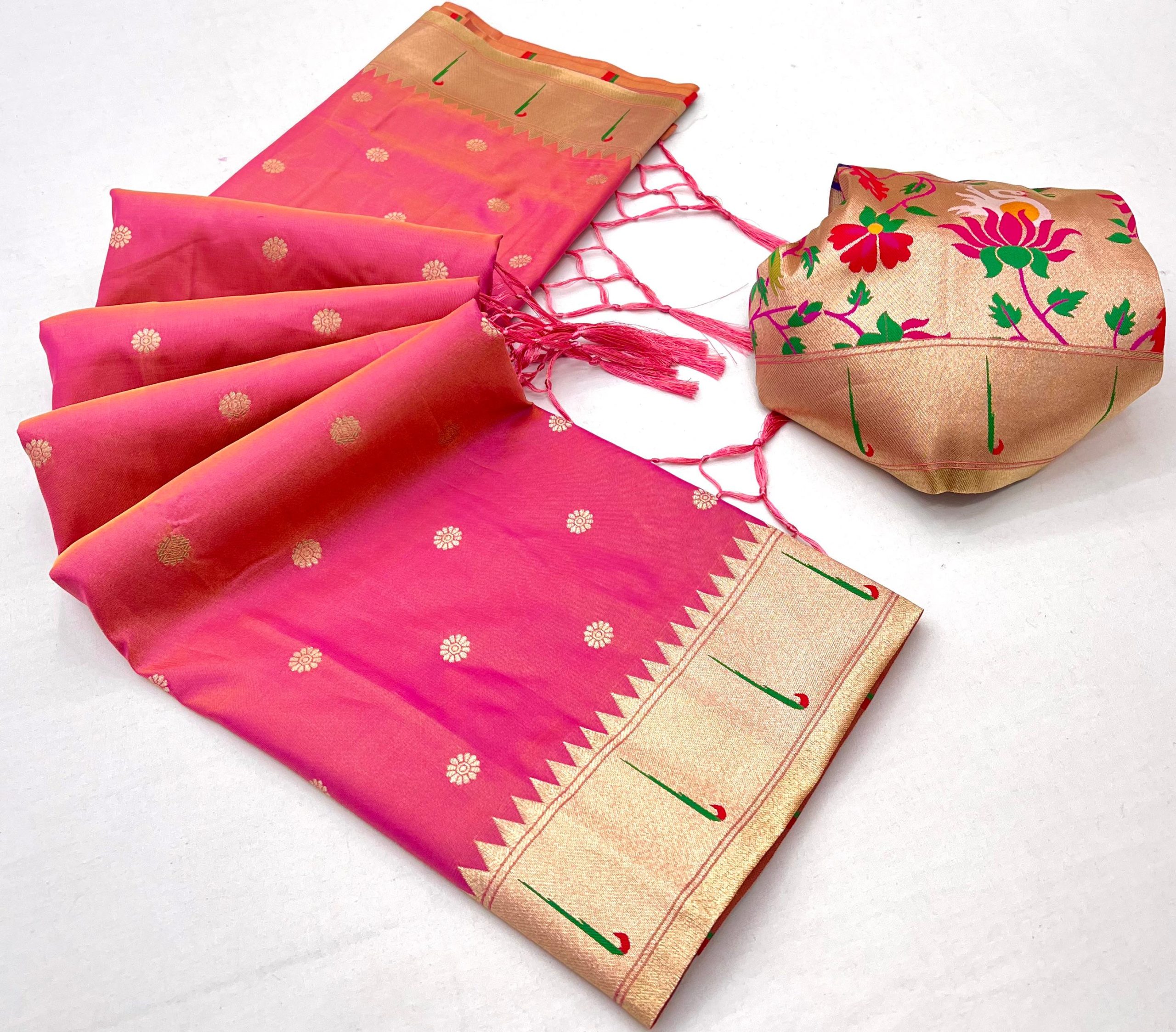 Saree :- A Pethani silk saree are woven using silk yarn and embellished with golden zari & Meenakari threads unique Motifs.