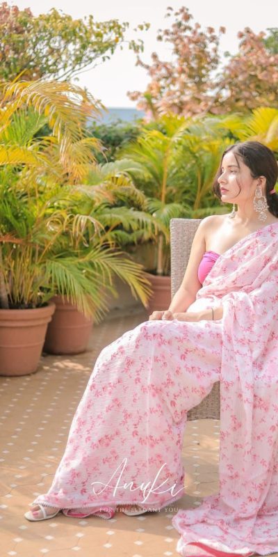 Pink Georgette Digital Crochet Work Saree