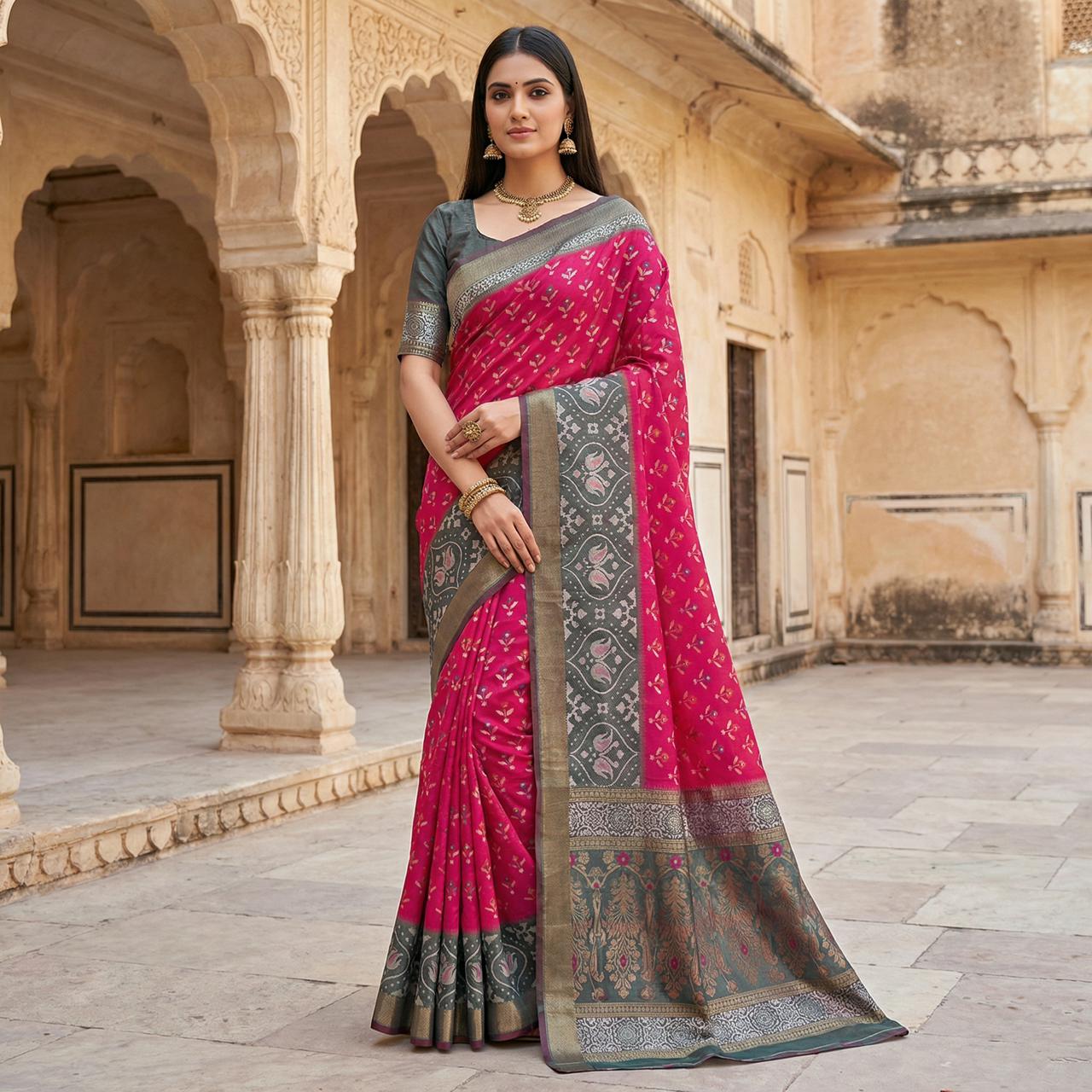 blend for a lustrous yet soft  With traditional Ikkat Pattern Contrast Border & Pallu with Zari Border which will give you a  yet attractive look. The best part of this woven work.