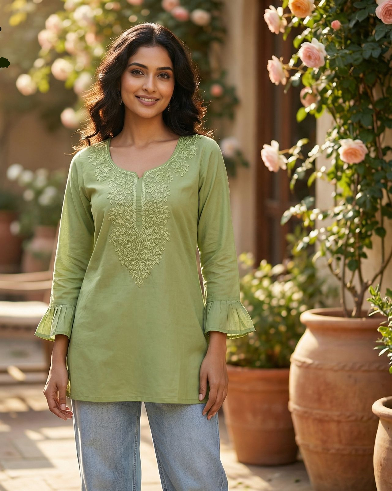 Kurti Work : Chikan Work with Fancy sleeves pattern