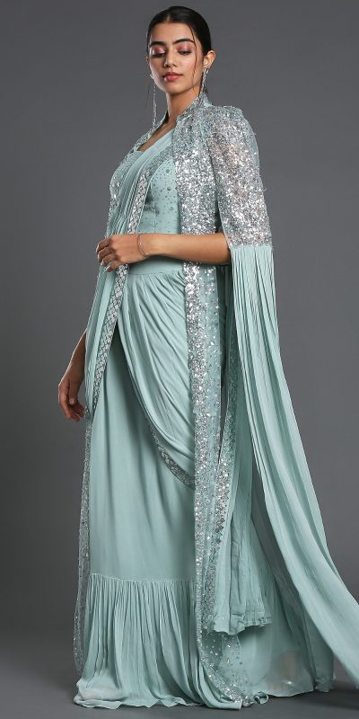 Pretty Light Blue Color Georgette Sequence Beautiful Frill Saree