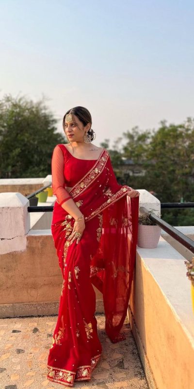Pretty Red Color Georgette Embroidery Zari And Sequence With Moti Work Saree