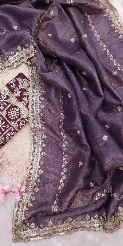 | Fabrics | Saree: Gold crush tissue silk saree with multi-sequence design work with heavy multi-sequence border Work :Paired with jacquard multi sequence worked blouse Type : Unstitched Work :Silk saree With Multi-Sequence |