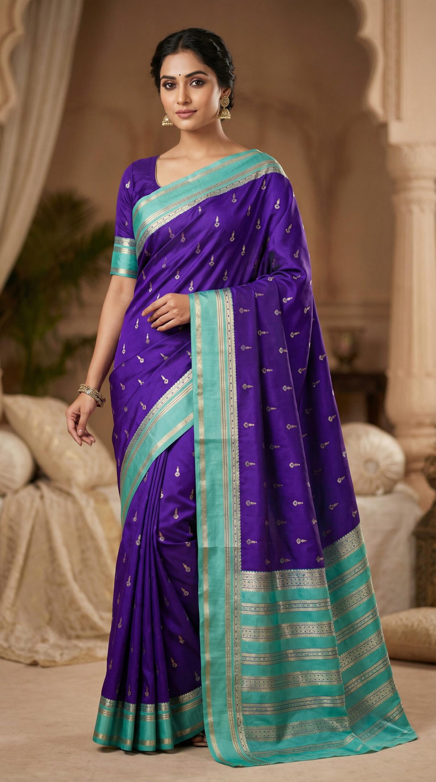 gold zari butta motifs across the body. The saree pallu zari weaving classic paisley and floral motifs.