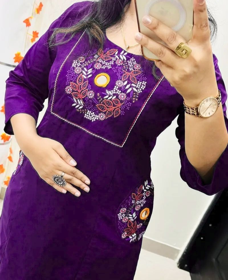 Purple Soft Cotton Slub Embroidery Work Kurti