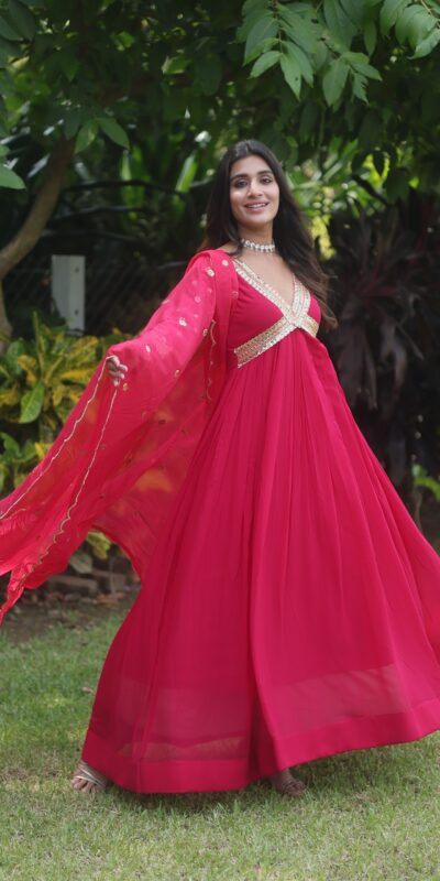 Rani Pink Faux Blooming Zari Embroidery Work Gown