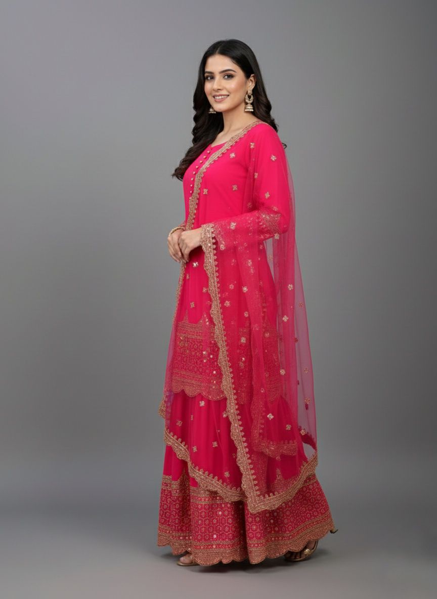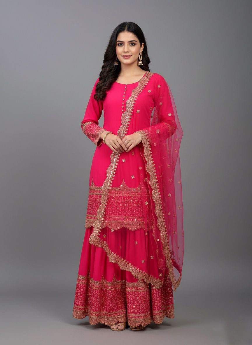 Top : Heavy Faux Georgette With Heavy 5mm Embroidery Sequence Work With Full Sleeve and Potli Button Inner : Heavy Micro cotton Length : 37-38 Inch Size : Free Size Work :Embroidery Sequence Work Type : Semi Stitched Palazzo :Heavy Faux Georgette With 5mm Embroidery Sequence Work With Fully Flair Palazzo inner :Heavy Micro Cotton Palazzo Length:40-41 InchDupatta : Heavy Net With 5mm Embroidery Sequence Work and Lace Border |
