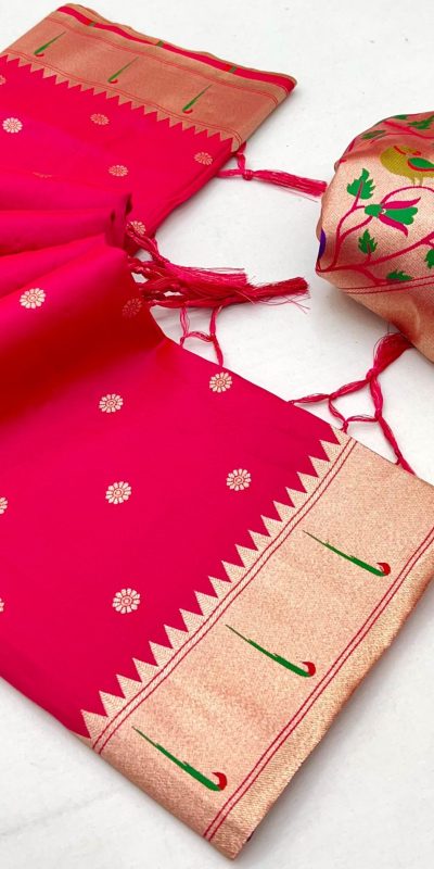 Saree :- A Pethani silk saree are woven using silk yarn and embellished with golden zari & Meenakari threads unique Motifs.