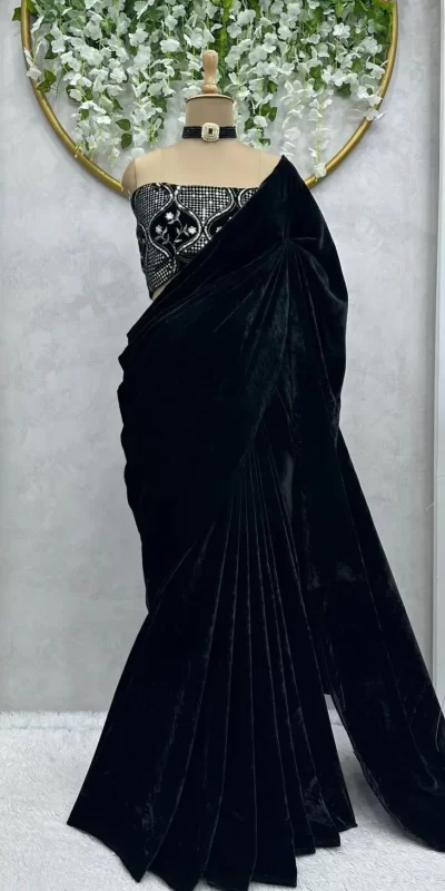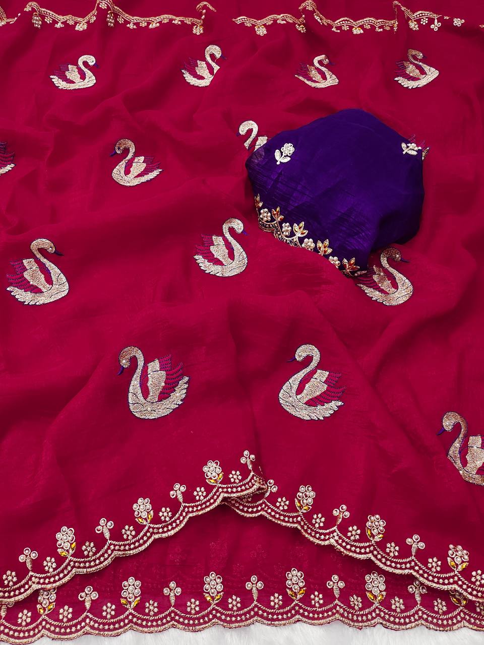 Saree Detail Saree Fabric : Crunchy Chiffon Saree Flower embroidered and Both Hand Moti Work & Diamond Work with Contrast Embroidery Blouse Piece.