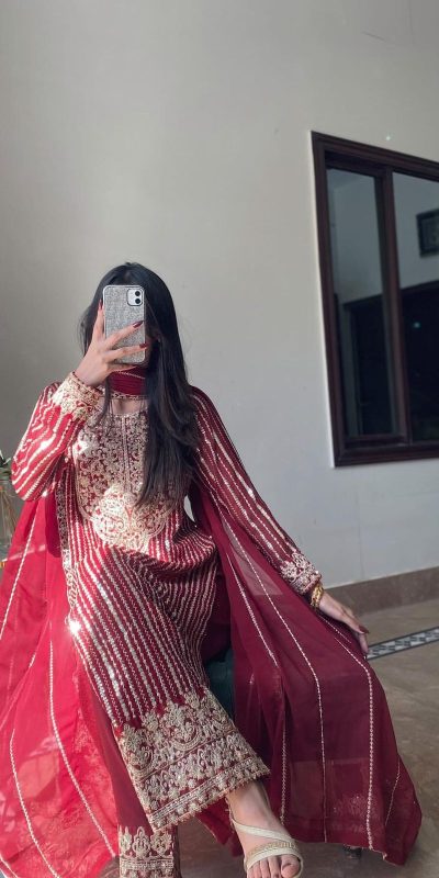 Top Fabric :- heavy Fox Georgette Work :- Heavy Embroidery With Thread & Sequence Work Inner :- Butter Crap Size :-Free Size Semi Stitched Length : 42-43 Inch Bottom Palazzo Fabric :- heavy Fox Georgette . Inner :-butter Crap Length : 40-41 inch Dupatta Fabric :- heavy Fox Georgette With Embroidery Work Size :- 2.10.meter |