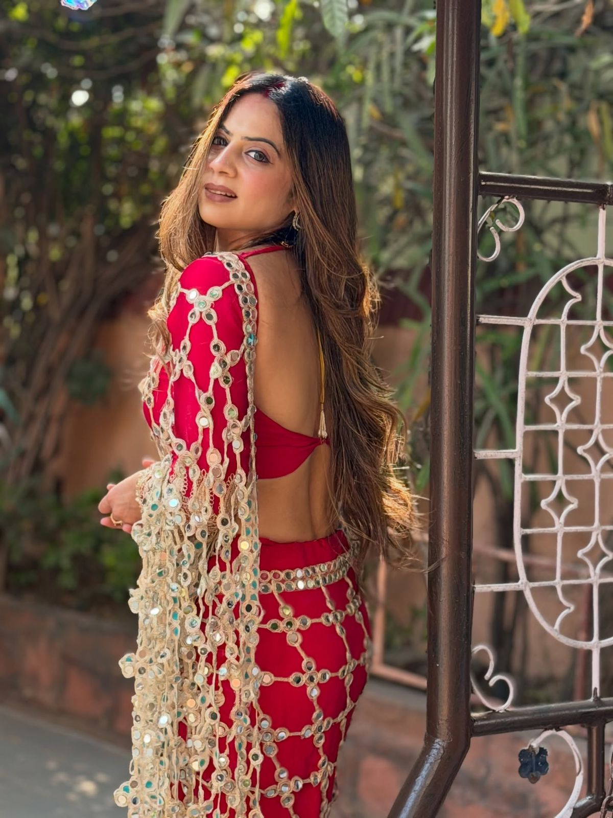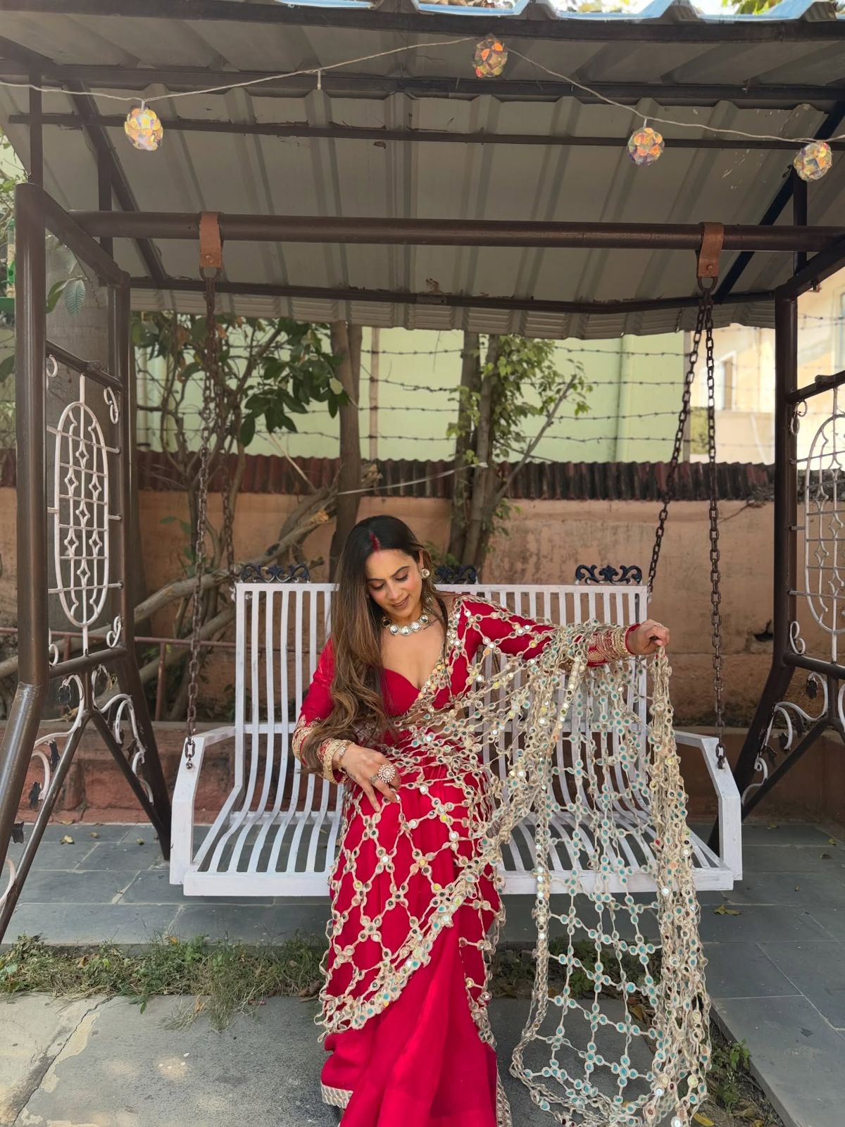 Ruffle style Indian saree ne pura modern twist de diya; elastic waist comfortable, layers bilkul even, perfect for birthday and cocktail shoots.