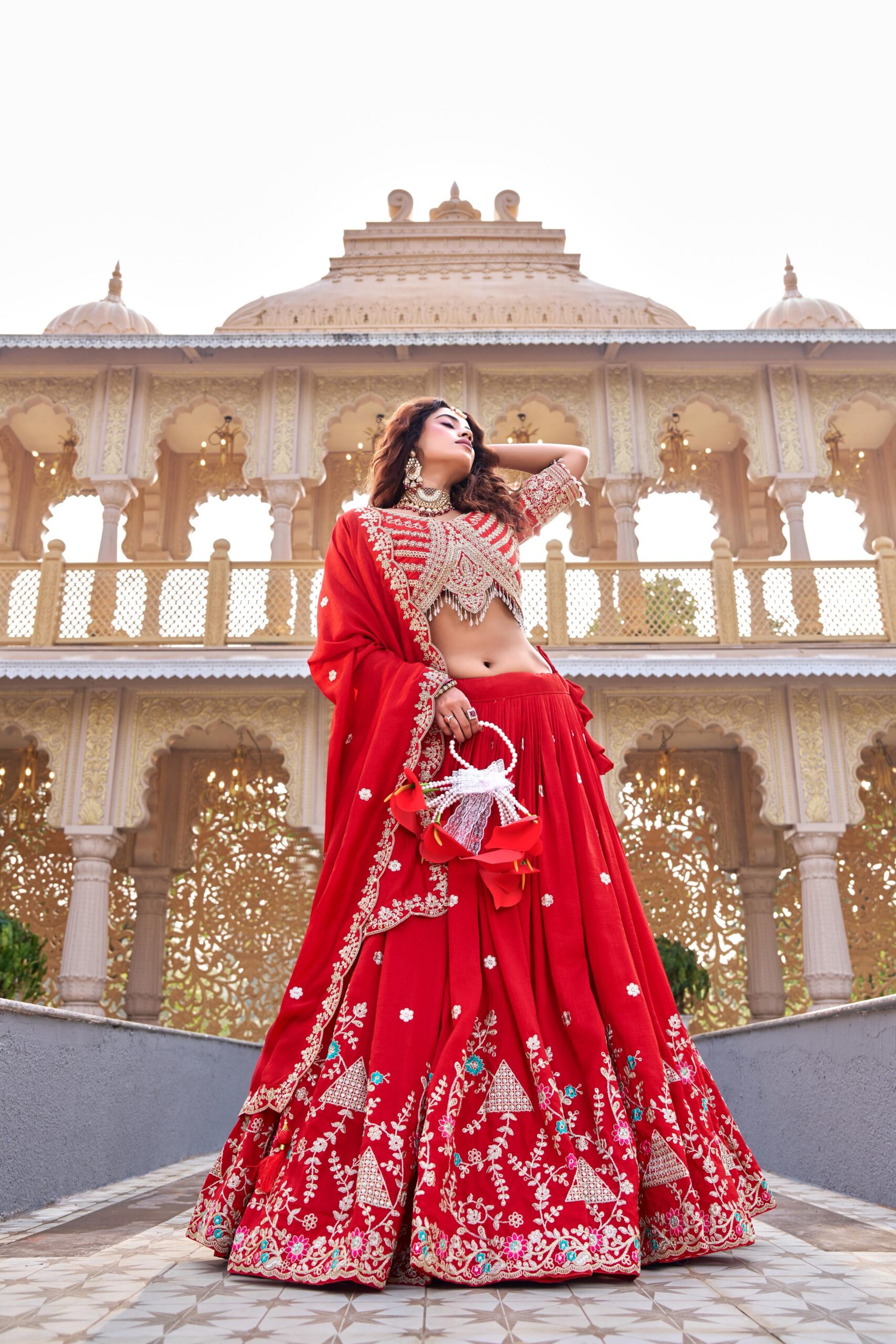 Red Vichitra Silk Thread Embroider Work Lehenga Choli