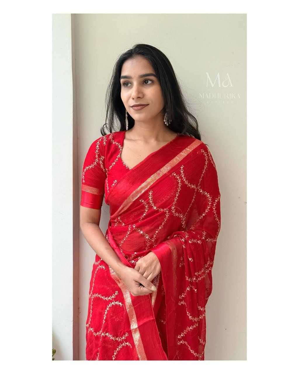 Red Viscose Satin Sequin Embroidery Work Saree