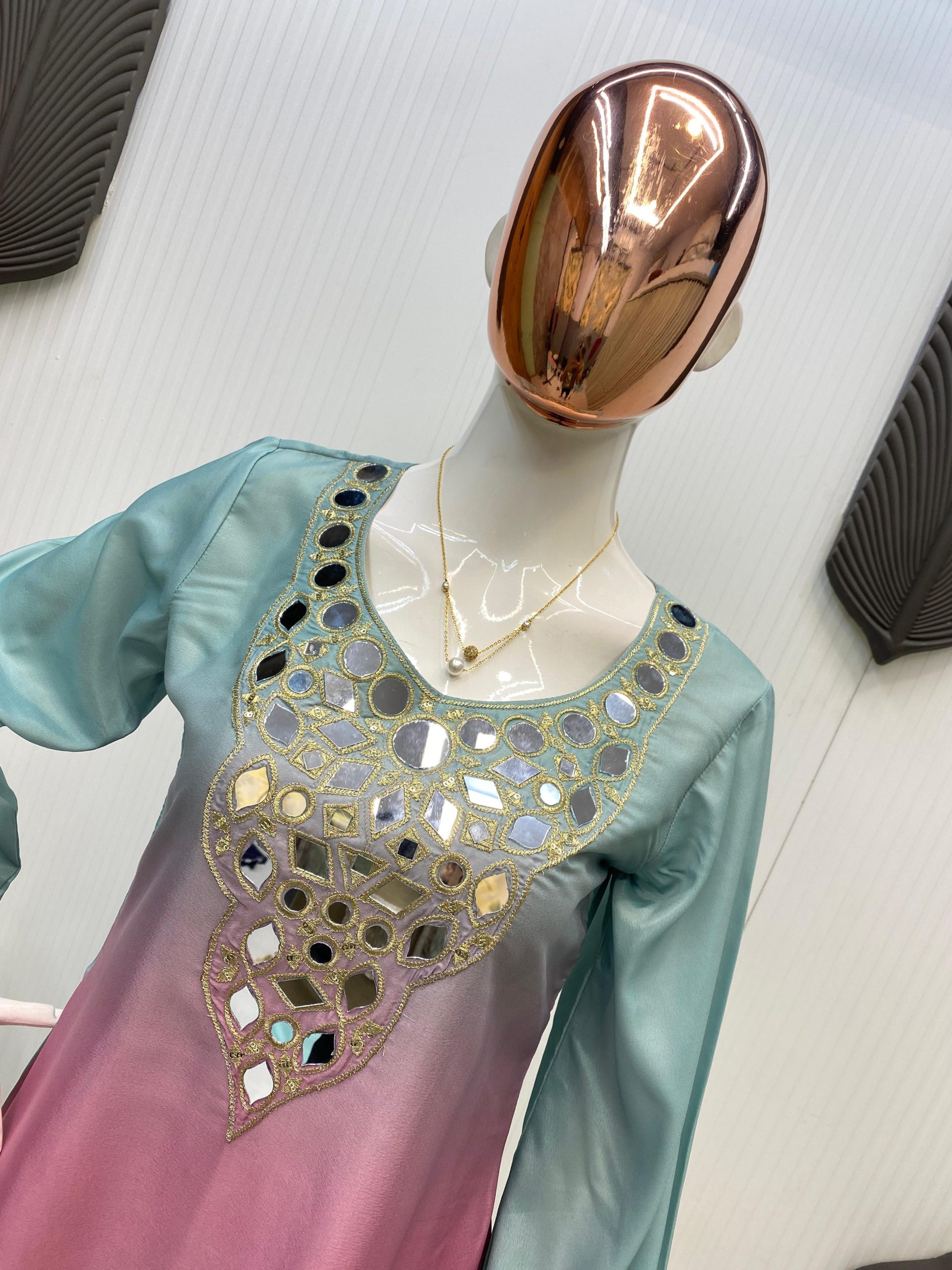 Sky Blue Printed Crape Silk Mirror Work Salwar Suit