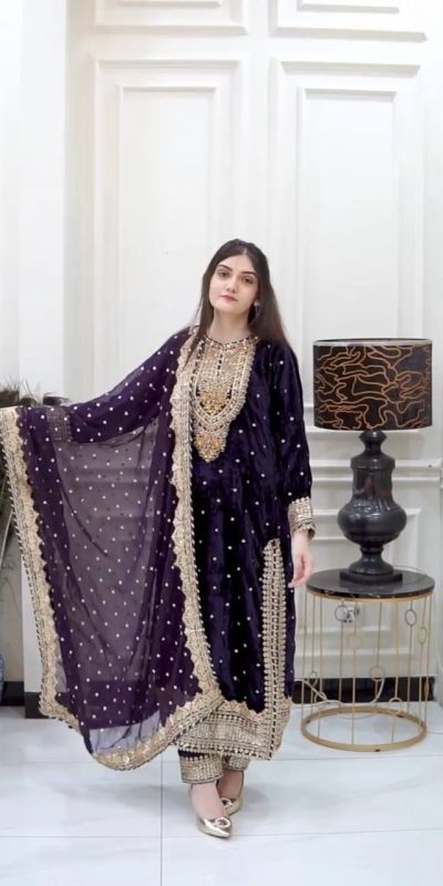 Fabrics Top Fabric :Pure Heavy Viscose Velvet With Heavy Embroidery Sequence Work neck moti work With Full Sleeves Top Inner : Micro Cotton Top Size : Free Size Top Length : 47-48 Inches Bottom Fabric : Viscose Velvet with Embroidery Sequence Work  Dupatta Fabric : Heavy Faux Georgette With Heavy Embroidery Sequence Work lace border