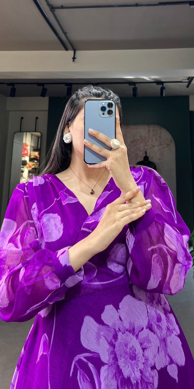 Stunning Purple Color Chiffon Floral Printed Party Wear Gown