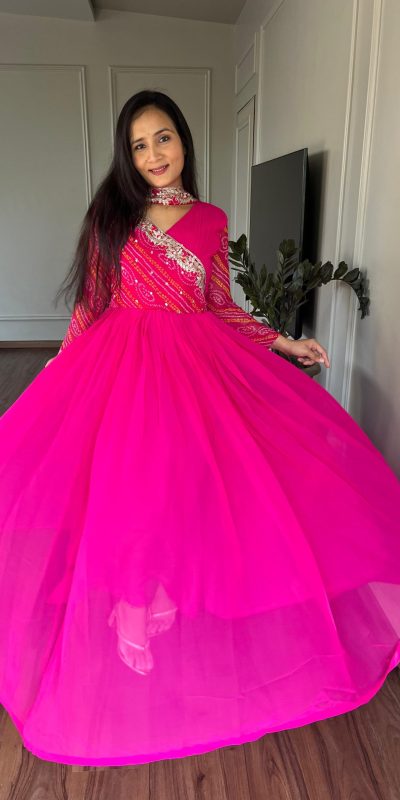 Fabrics Fabric:- pure Bandhej with Fox Georgette Work:- 3mm sequence Embroidery work Flair:- 3.5mtr Inner:- Micro Cotton Size:-  Free Size Sami Stitched Fully StitchedDupatta Fabric :- Fox Georgette Work :- 3mm sequence Embroidery work Length:- 2.30 Meter