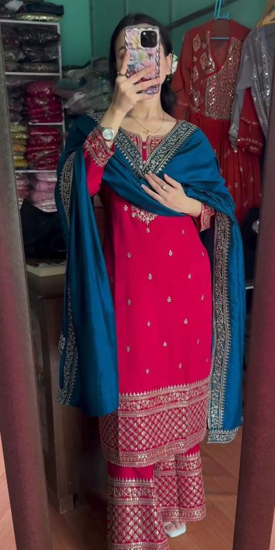 Superb Pink Color Chinnon Silk Embroidery Work Salwar Suit