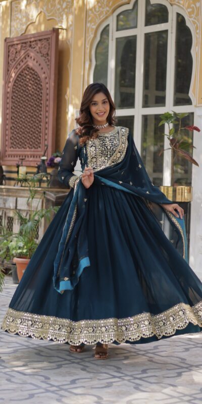 Teal Faux Blooming With Embroidery Zari Work Gown