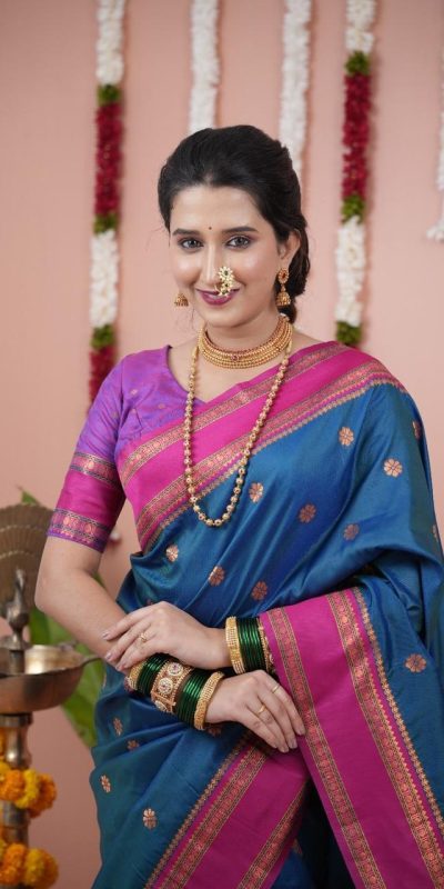 Fabric: Pure Banarasi Silk Paithni Work : Golden Banarasi zari weaving Blouse: Matching Blouse with all Zari weaving |