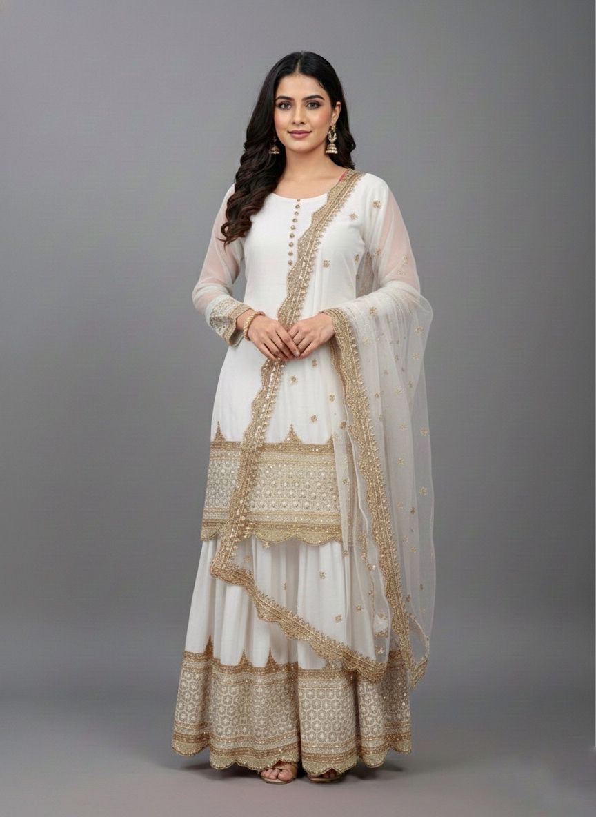 Top : Heavy Faux Georgette With Heavy 5mm Embroidery Sequence Work With Full Sleeve and Potli Button Inner : Heavy Micro cotton Length : 37-38 Inch Size : Free Size Work :Embroidery Sequence Work Type : Semi Stitched Palazzo :Heavy Faux Georgette With 5mm Embroidery Sequence Work With Fully Flair Palazzo inner :Heavy Micro Cotton Palazzo Length:40-41 InchDupatta : Heavy Net With 5mm Embroidery Sequence Work and Lace Border |