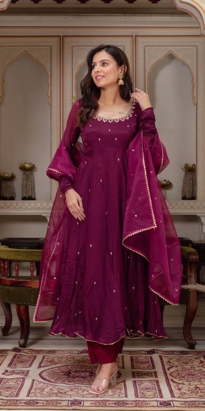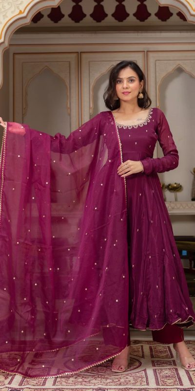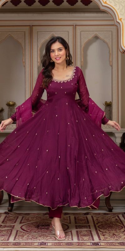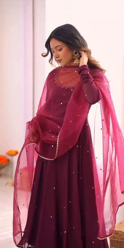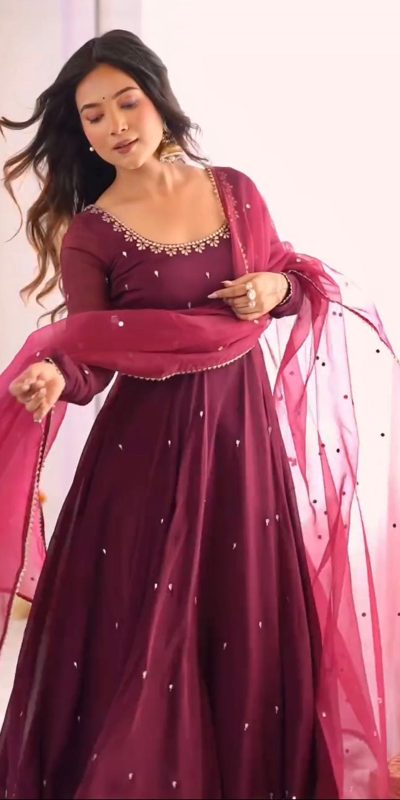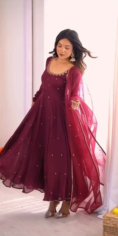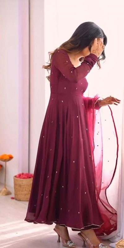 Wine Fox Georgette Embroidery Bead Work Gown