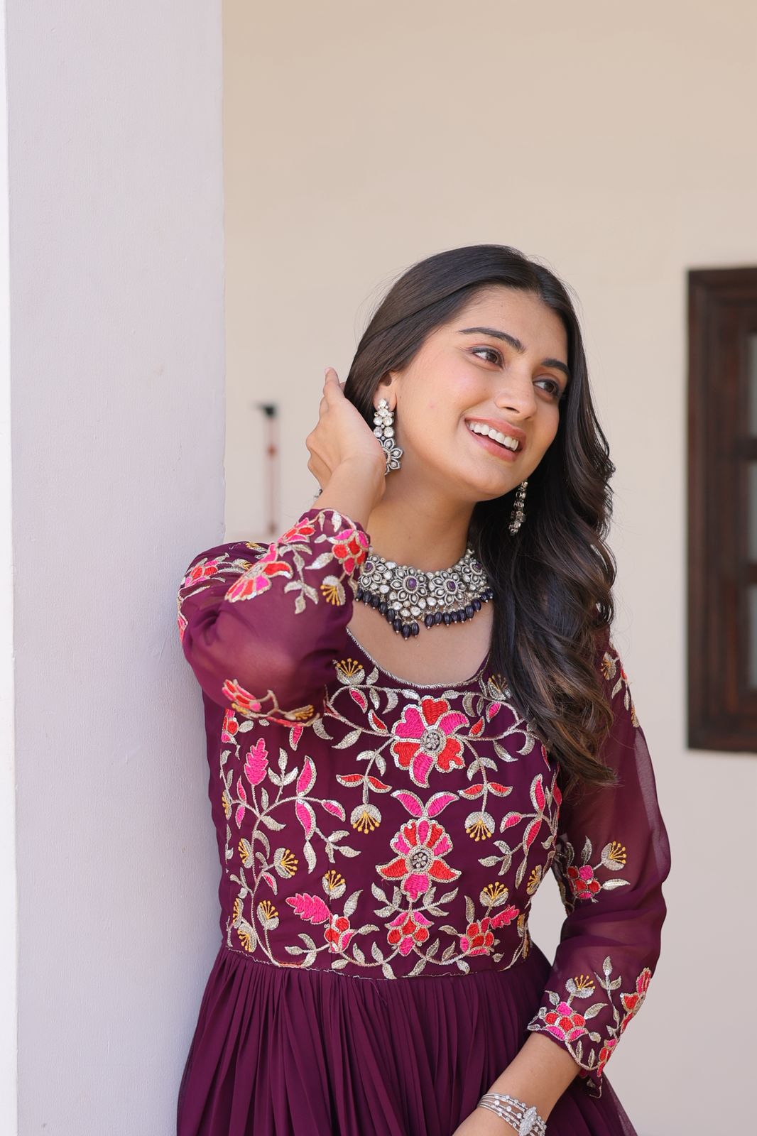 Gown Fabric:- Fox Georgette Work:- Heavy 3mm sequence Thread Work Inner:- Micro Cotton Flair:-7.50 mtr Size:- free Size Semi Stitched (Fully Stitched) |
