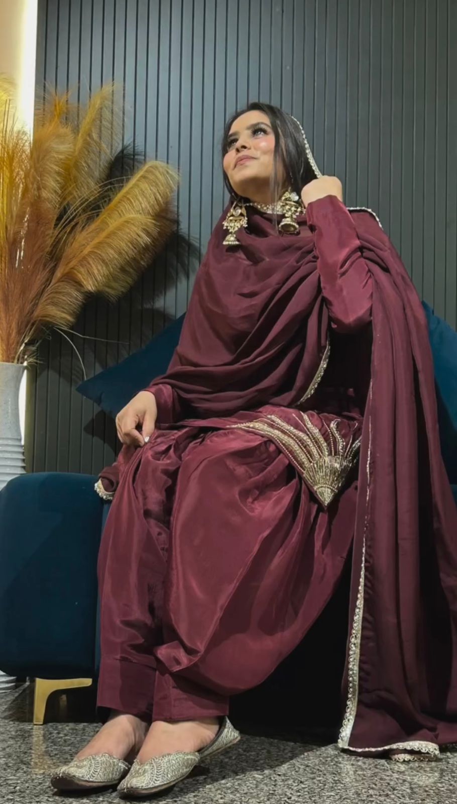 Wine Natural Crep Silk With Hand Work Salwar Suit