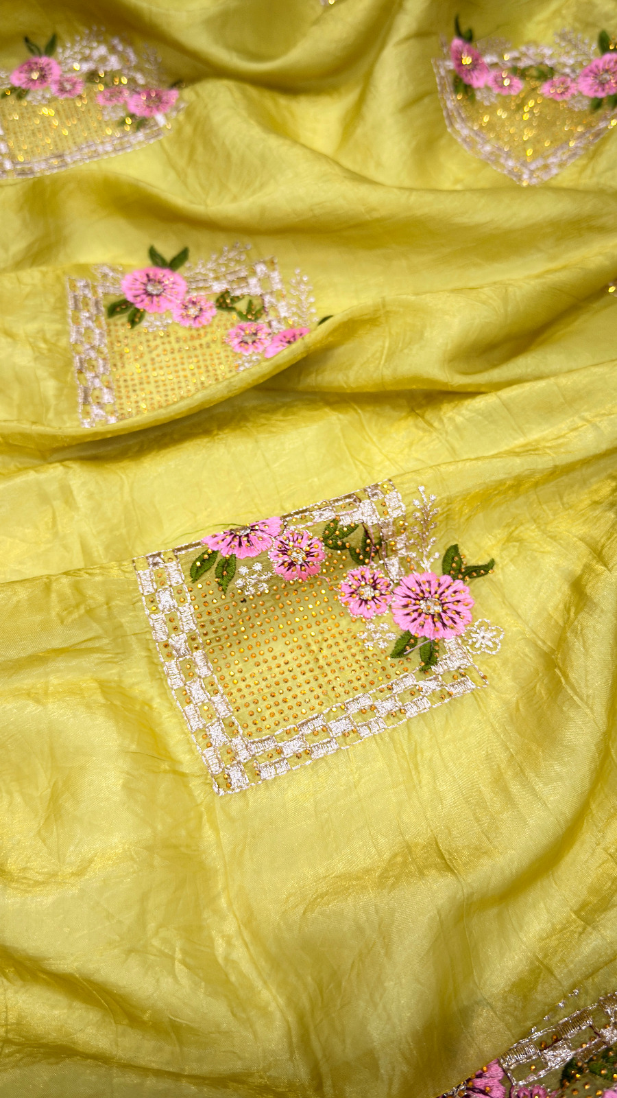 Saree Detail Saree Fabric : Pure paper silk crush Saree Work : Beautiful Floral Embroidery all over The Saree It also has Swarovski work on the buttas. With very beautiful cut work borderBlouse Fabric : Teamed with a Beautiful Pure Benarasi Silk Contrast Blouse
