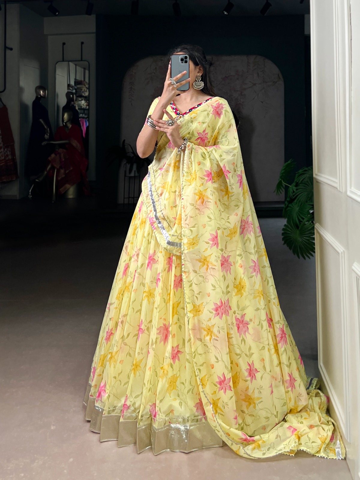 LNB 1716 Yellow Color Tabby Silk Floral Print Embossed Design Lace Lehenga Choli Wedding, Party, Festive, Events Etc. Delivery 4-6 Working Days Rs 2499 | Creative Lehenga, Bollywood Lehenga, Designer Lehenga, Embroidered Lehenga, Lehenga, Party Wear Lehenga